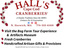 Visit our working Cape cod Cranberry Bog Farm Tours (by reservation @ hallscran2@gmail.com) & Antique equipment display. Hand Crafted Artisian Gifts & Provisions. We are located where the Commercial Cranberry Industry began on Cape Cod. 489 Depot Street, Harwich Ma 02645